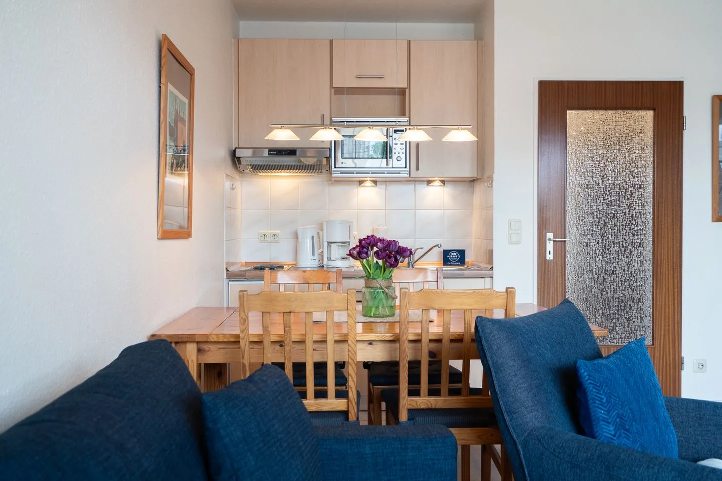 Die Küche ist vollständig eingerichtet, mit allem, was Ihr zur Zubereitung Eurer Mahlzeiten benötigt, inklusive eines 2-Platten-Herds und einer Mikrowelle. Praktische Geräte wie eine Kaffeemaschine und ein Toaster machen die Selbstversorgung zum Kinderspiel.