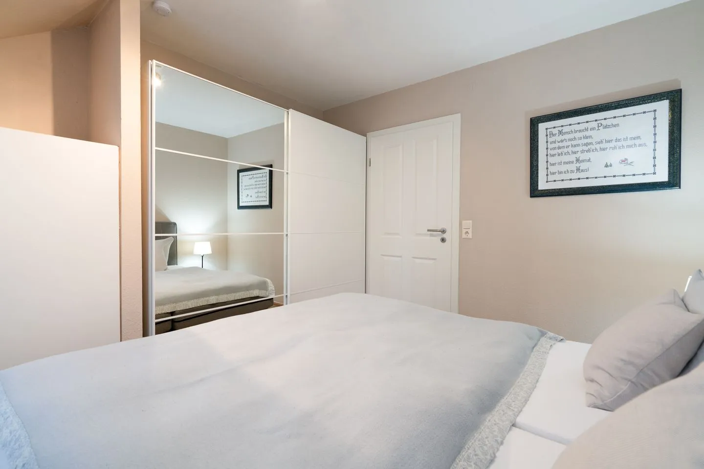 Im separaten Schlafzimmer erwartet Euch ein bequemes Doppelbett (180x200 cm, getrennte Matratzen), ein geräumiger Kleiderschrank und Außenrollläden für erholsame Nächte. Hier findet Ihr den perfekten Rückzugsort für ruhige Stunden und einen entspannten Schlaf.