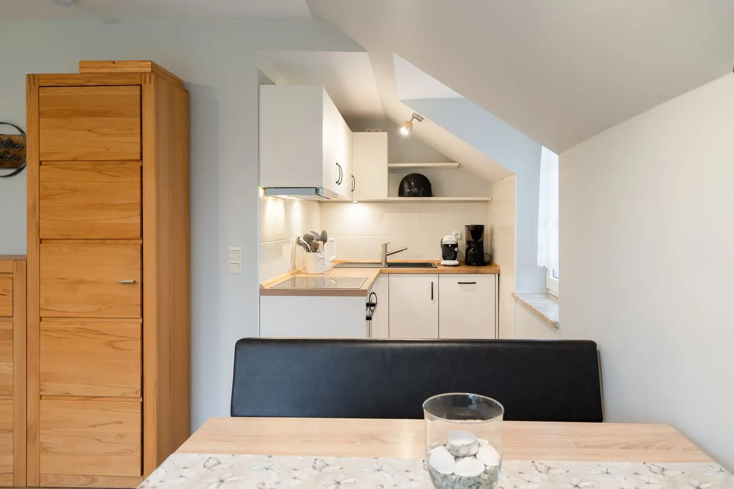 Die integrierte Küchenzeile ist funktional und modern ausgestattet: Ceranfeld, Backofen, Mikrowelle, Kühlschrank mit Gefrierfach, Spülmaschine, Wasserkocher, Toaster und Kaffeemaschine stehen Euch zur Verfügung. Geschirr und Küchenutensilien sind ausreichend vorhanden, sodass Ihr Euch ohne Aufwand ein leckeres Frühstück oder ein gemeinsames Abendessen zubereiten könnt.