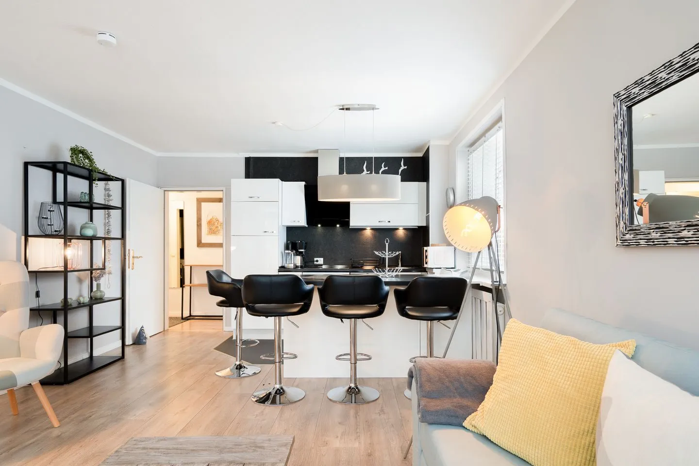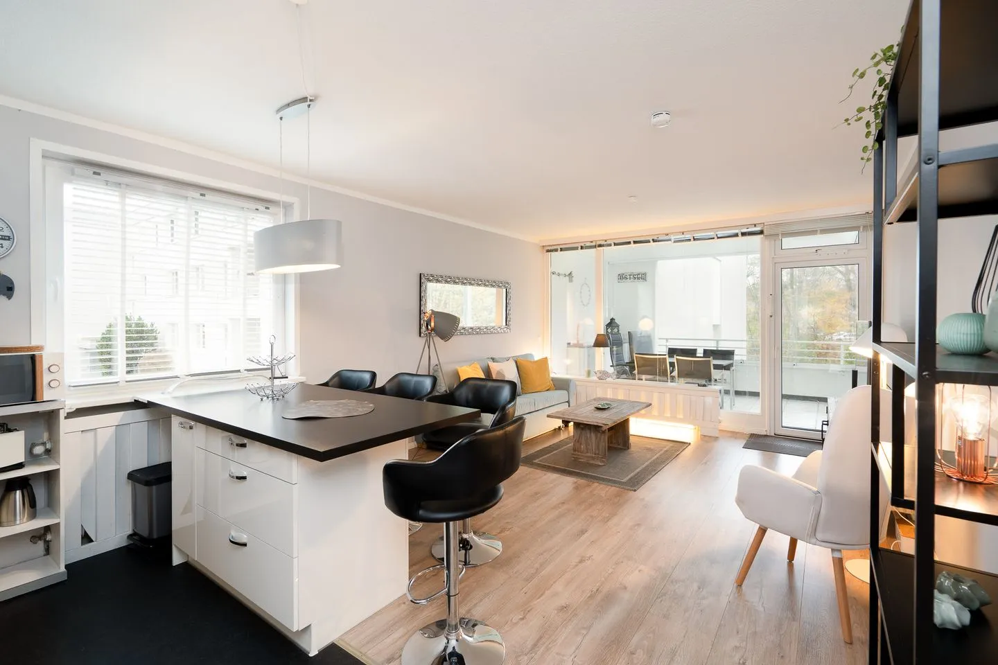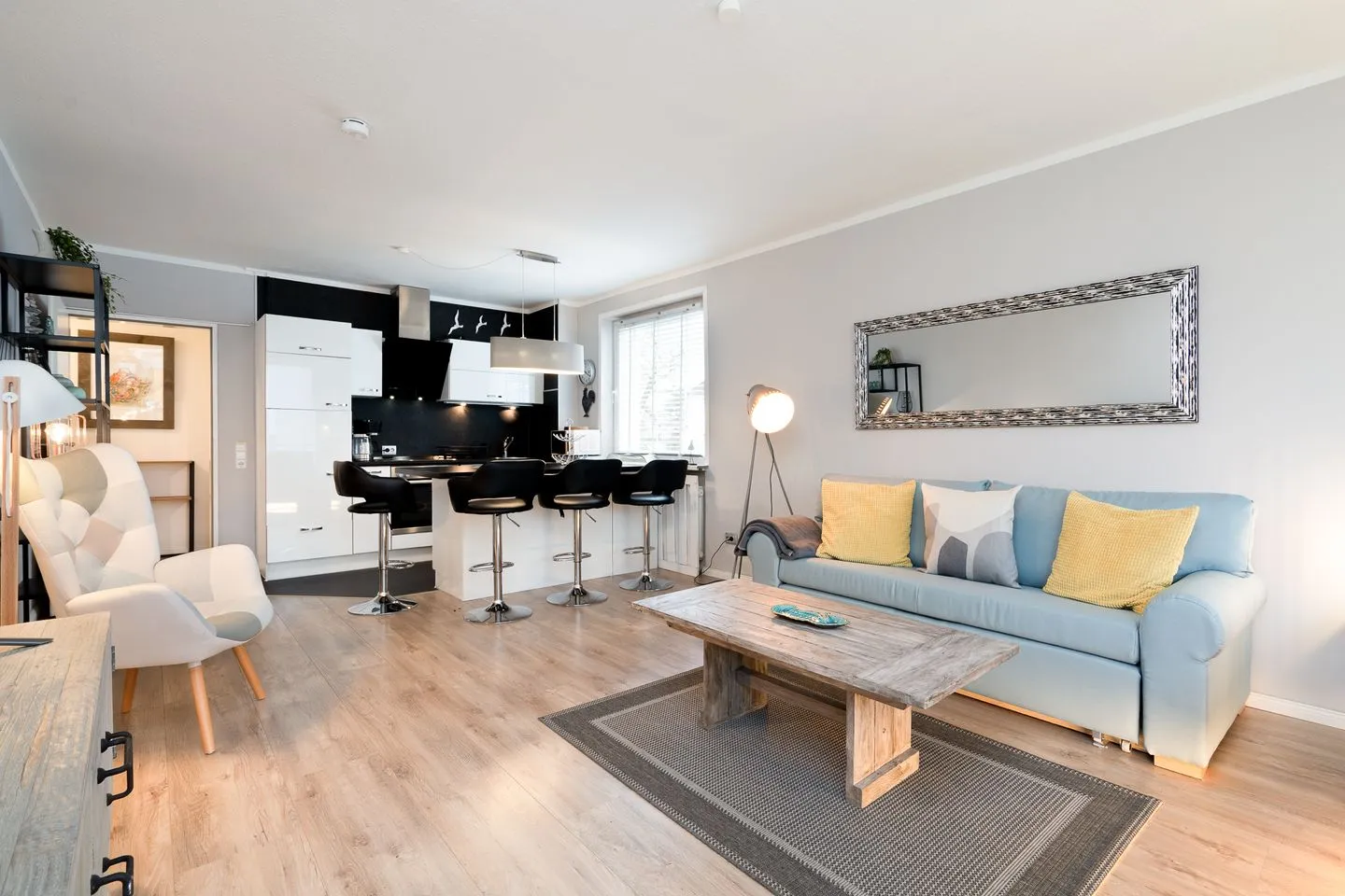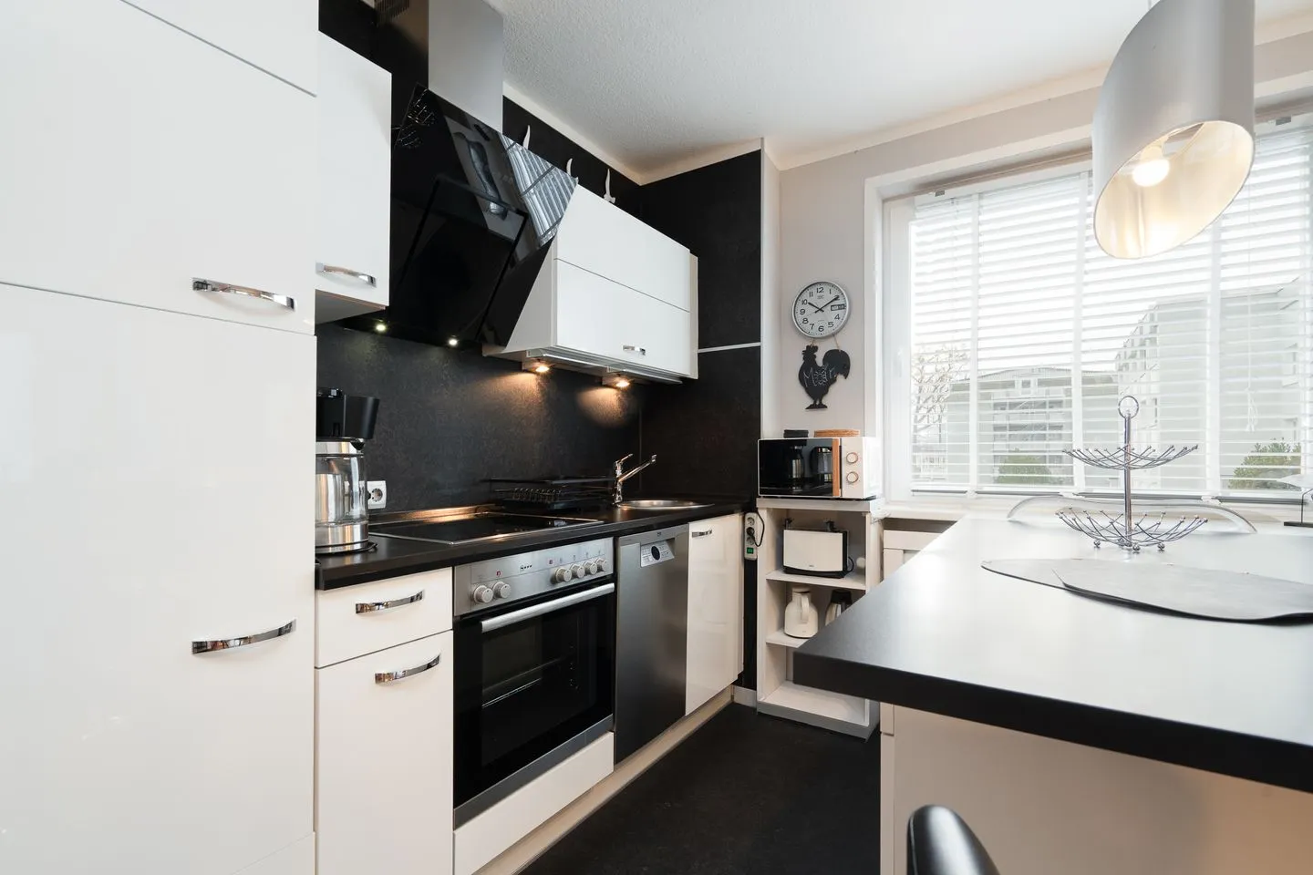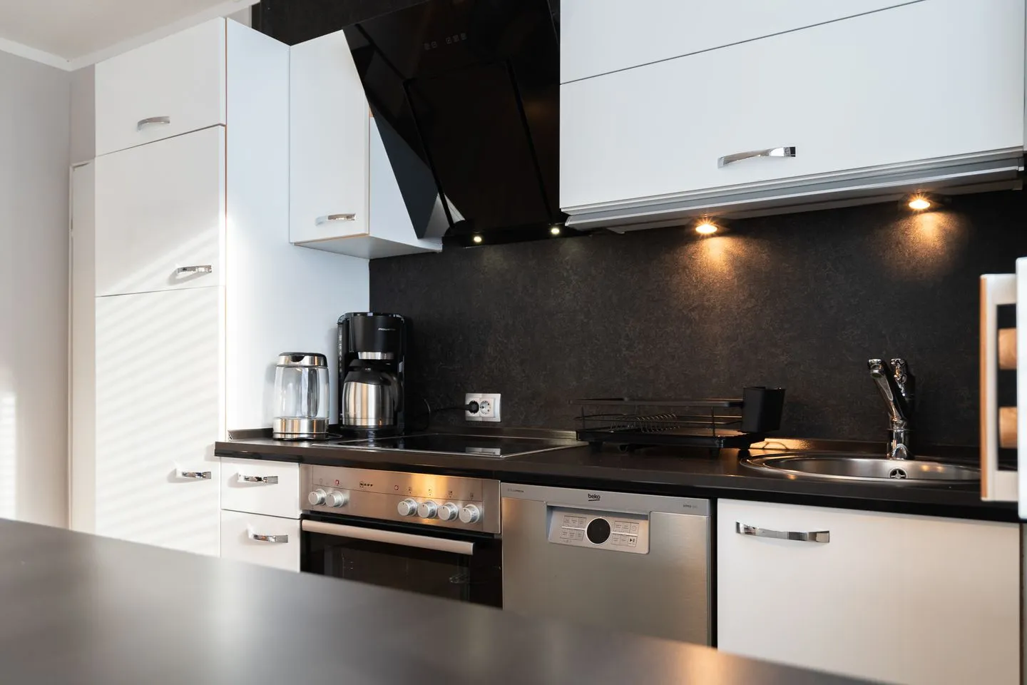 Die hochwertige, offene Küche ist komplett ausgestattet – inklusive Backofen, Herd, Spülmaschine, Kühlschrank mit Gefrierfach, Mikrowelle, Kaffeemaschine, Wasserkocher und Toaster. Durch die helle Gestaltung und den großzügigen Arbeitsbereich macht Kochen hier richtig Spaß. Alles ist darauf ausgerichtet, dass Ihr Euch direkt wohlfühlt.