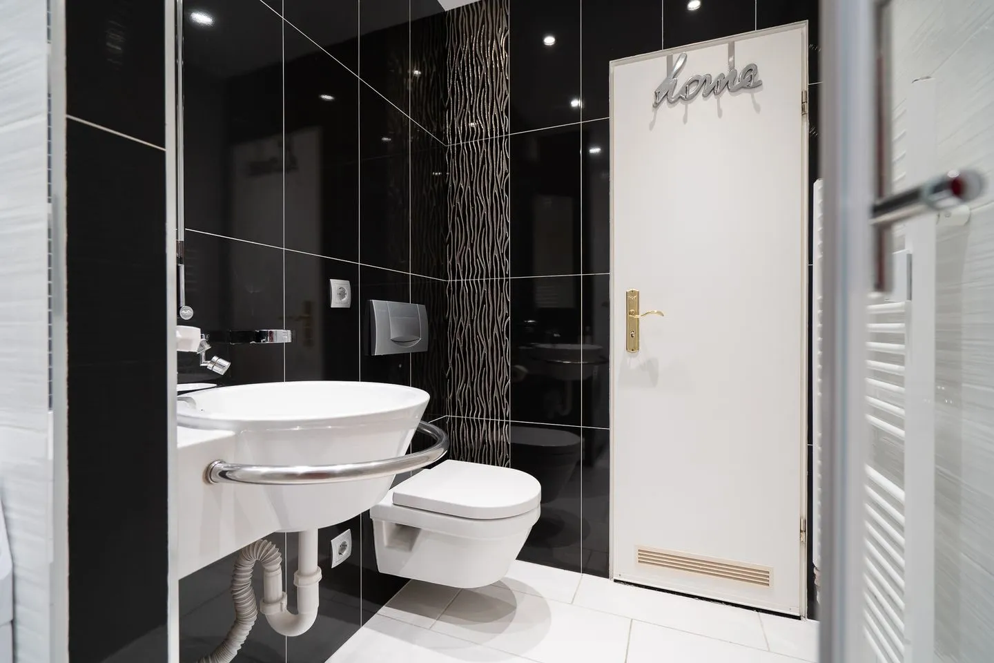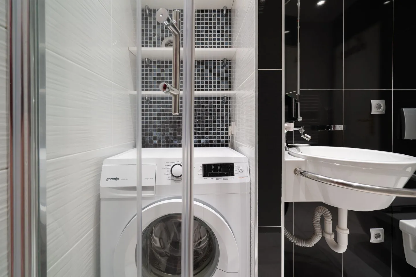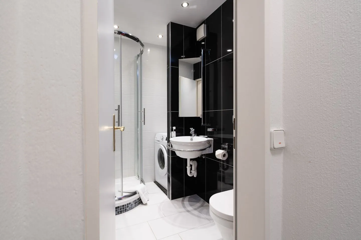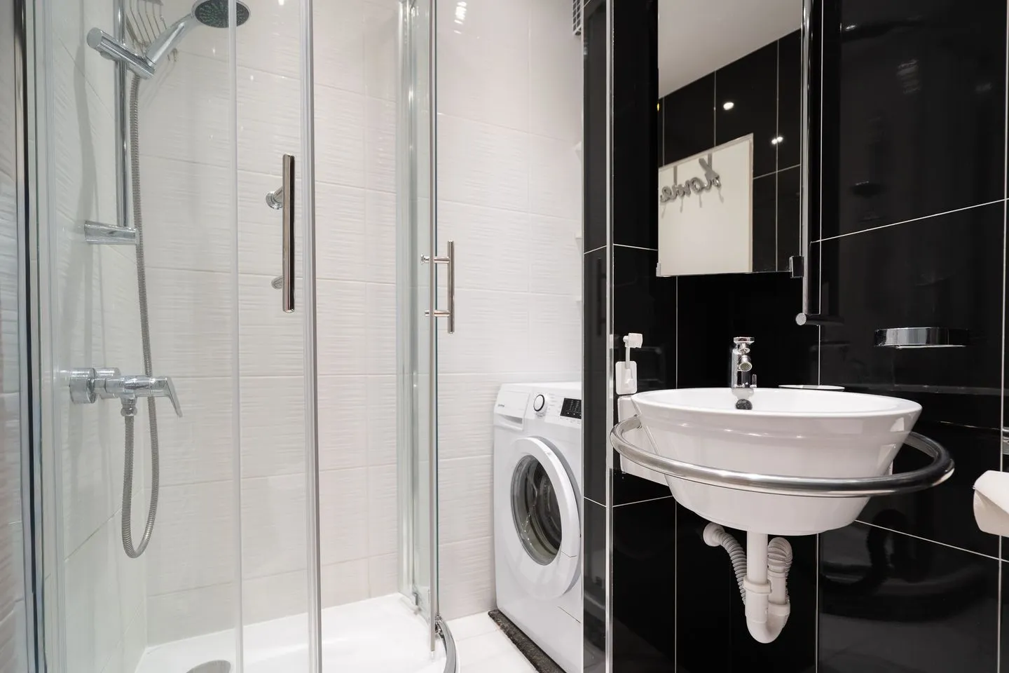 Das Badezimmer ist elegant in Schwarz-Weiß gehalten und verfügt über eine komfortable Dusche, ein Waschbecken mit großem Spiegel und eine Waschmaschine zur Eigennutzung. Hochwertige Armaturen und eine klare Linienführung runden das stilvolle Gesamtbild ab.
