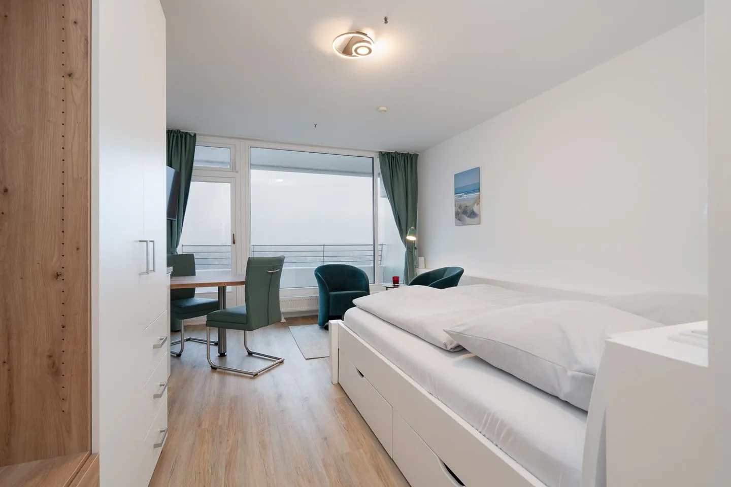 Der offene Wohn- und Schlafbereich verbindet Komfort mit modernem Design. Das gemütliche Doppelbett (160x200) sorgt für erholsame Nächte, während zwei stilvolle Sessel mit Beistelltisch zum Entspannen einladen – perfekt für ruhige Stunden mit Blick Richtung Ostsee. Ein Flachbild-TV und die warme Beleuchtung schaffen eine angenehme Atmosphäre. Der Essbereich am Fenster ist ideal für gemeinsame Mahlzeiten mit traumhaftem Ausblick.