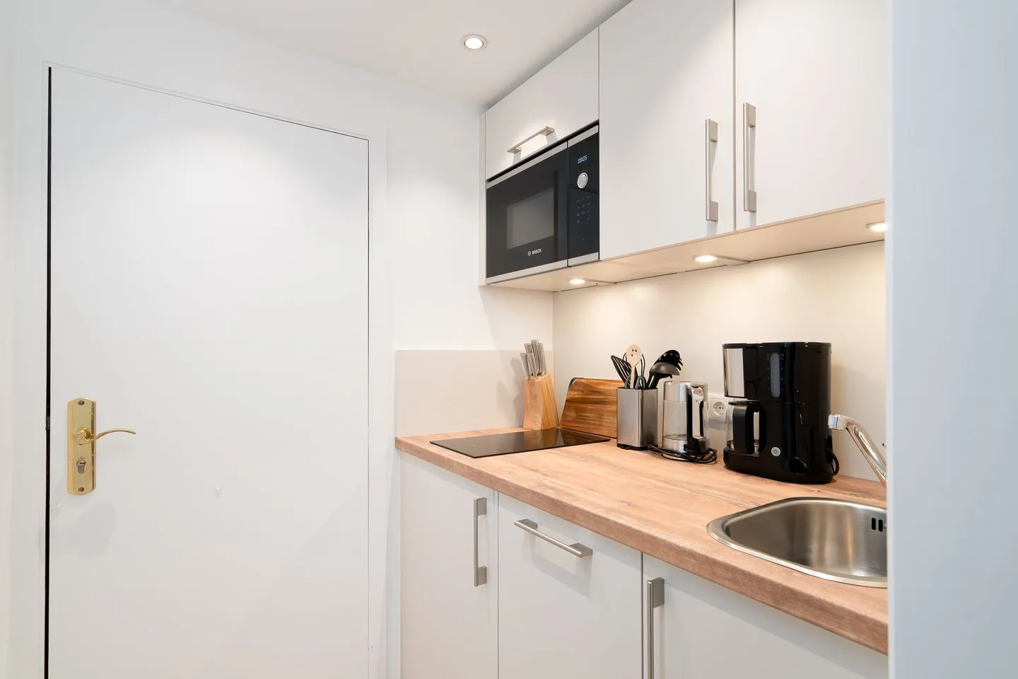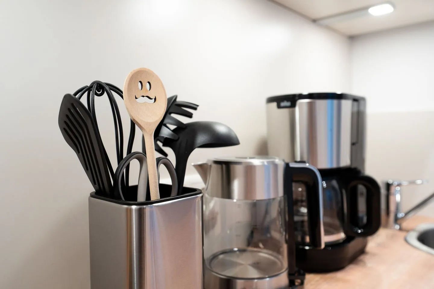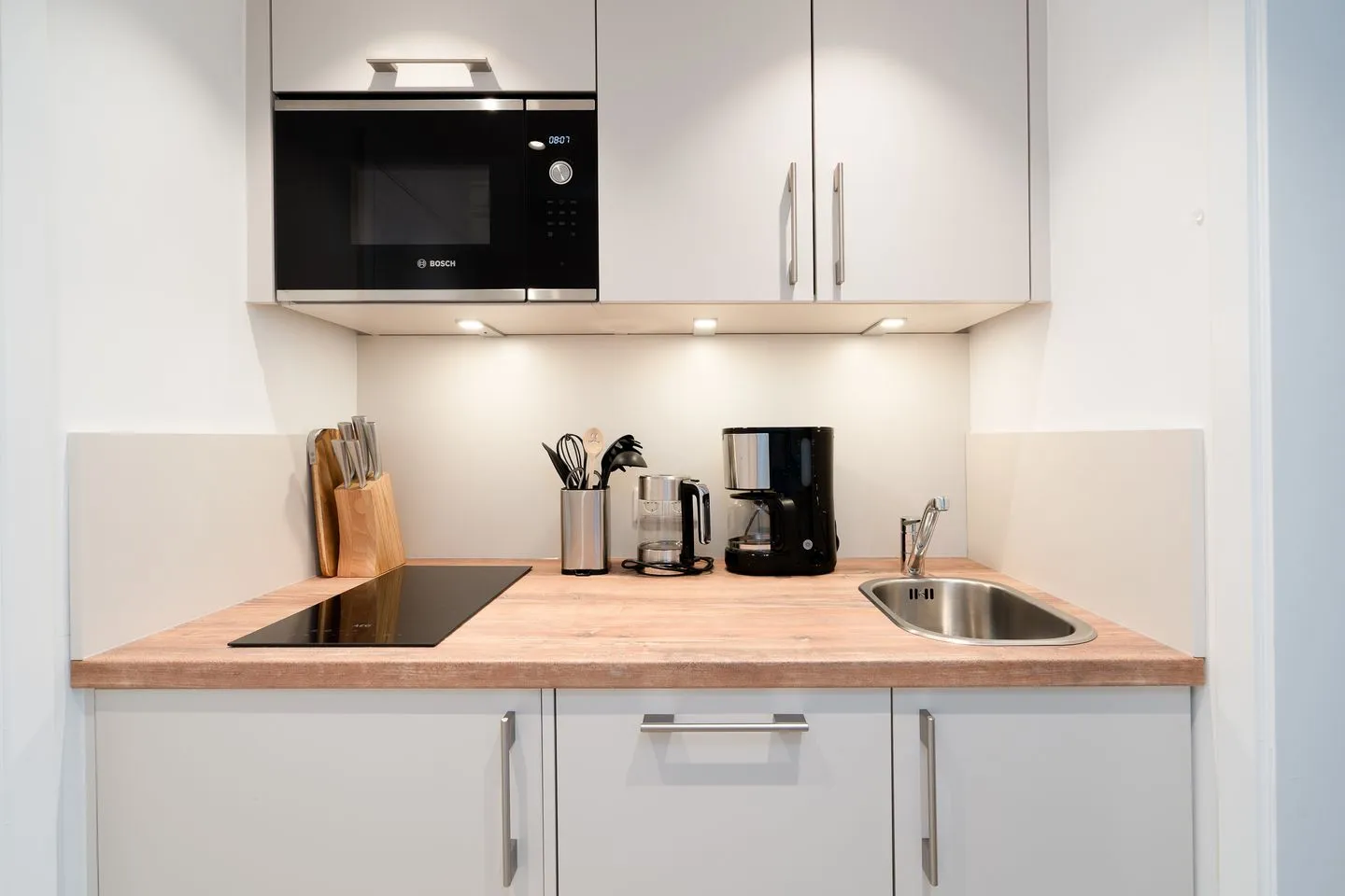 Die offen integrierte Küchenzeile ist modern und funktional ausgestattet: 2er Kochfeld, Mikrowelle, Spülmaschine, Kaffeemaschine, Wasserkocher sowie ausreichend Arbeitsfläche stehen Euch zur Verfügung – ideal für das Frühstück vor dem Strandspaziergang oder ein kleines Abendessen nach einem aktiven Urlaubstag.