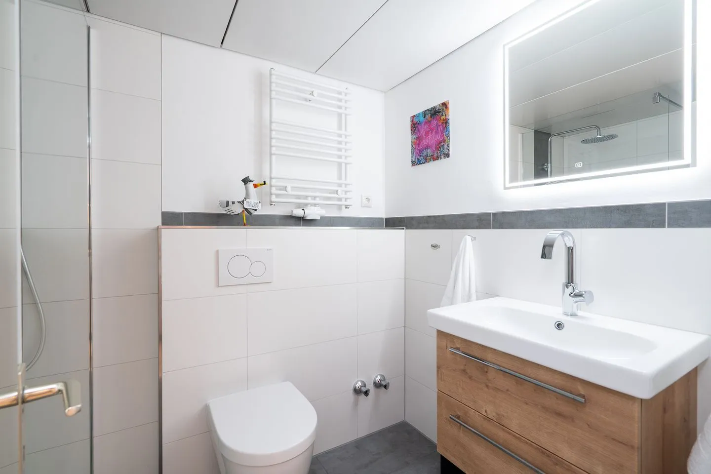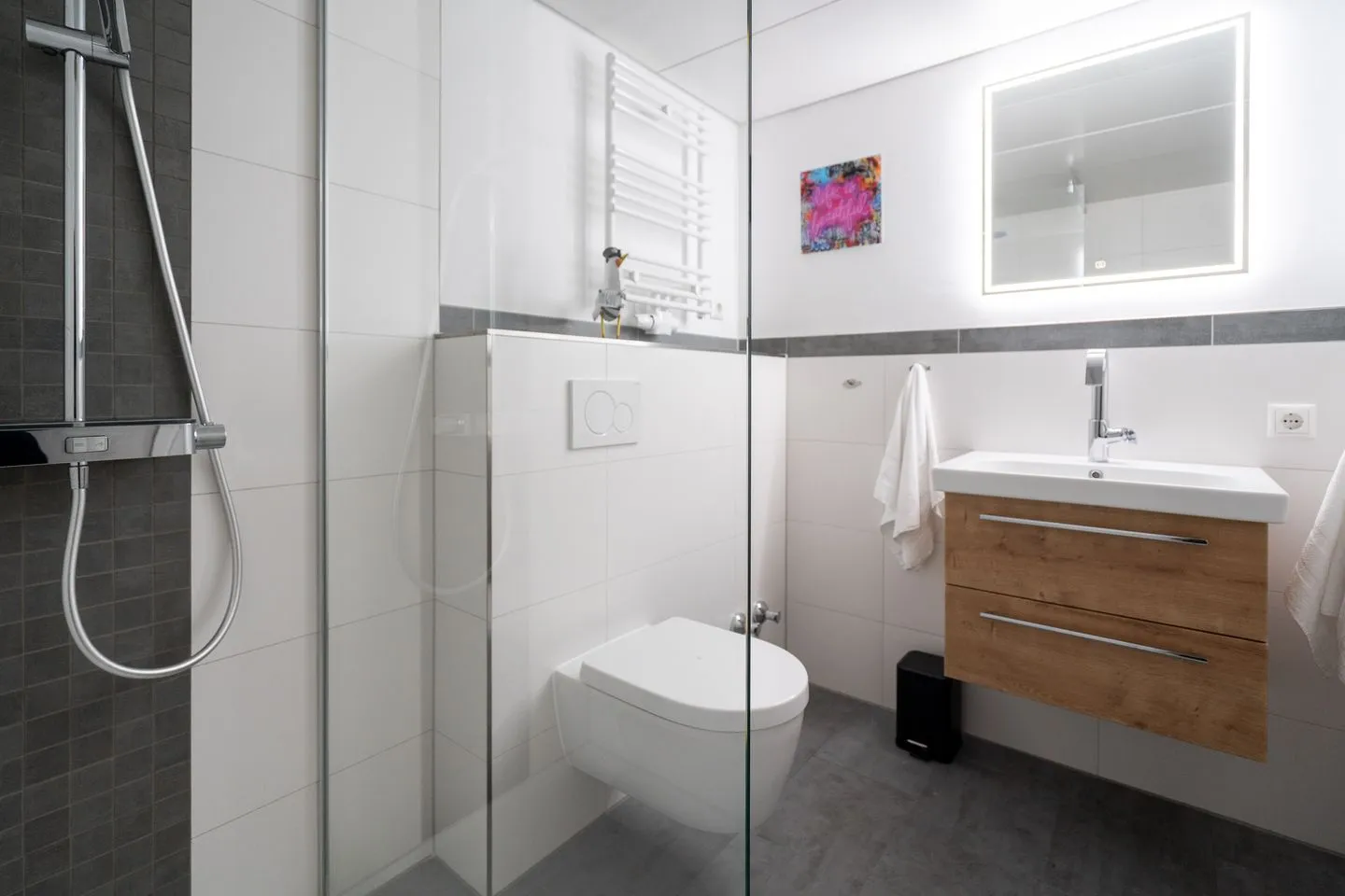 Das moderne Duschbad überzeugt mit klarer Linienführung, hochwertiger Ausstattung, Handtuchtrockner, großem Spiegel und einer großzügigen Dusche – perfekt für einen frischen Start in den Tag oder zum Entspannen am Abend.